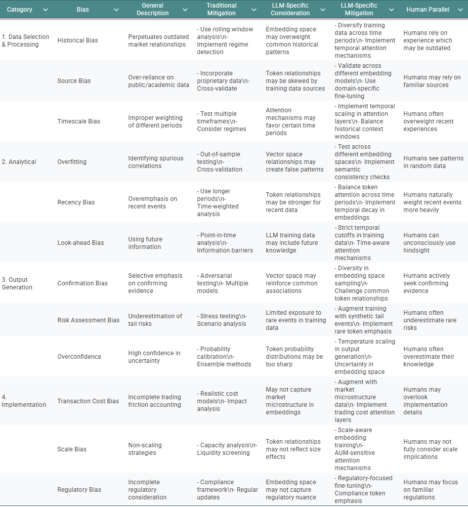 As we continue to integrate LLMs into quantitative research processes, understanding these biases becomes increasingly critical. This framework serves as a starting point for developing more robust and reliable research methodologies that leverage the strengths of both human and artificial intelligence while mitigating their respective weaknesses.